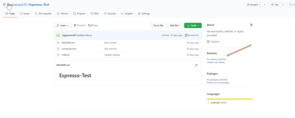 Go to the GitHub repository page. In the middle left, there is a section named `Releases.` We do not have created any release so, click on `Create a new release.`