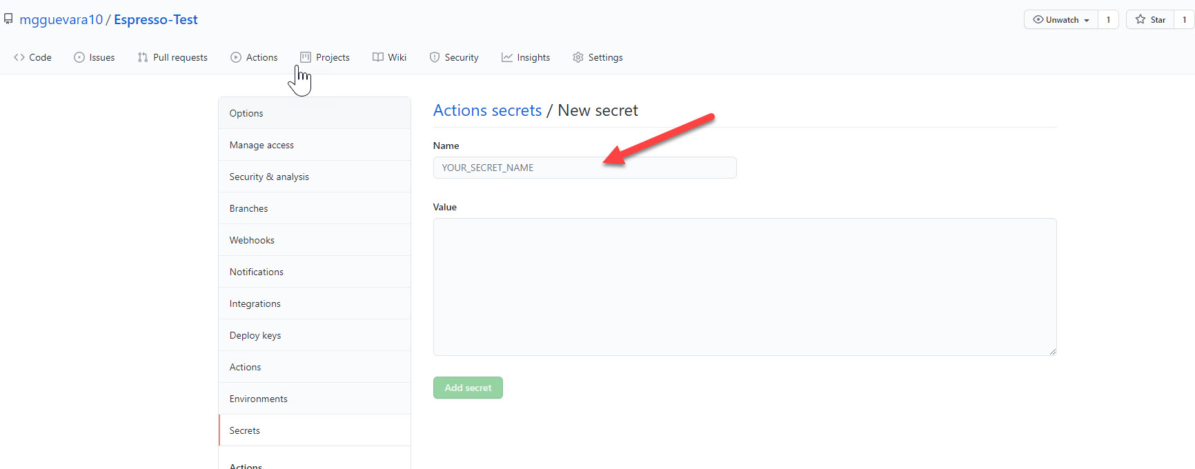 Click on `New repository secret.` Then, copy the contents of the