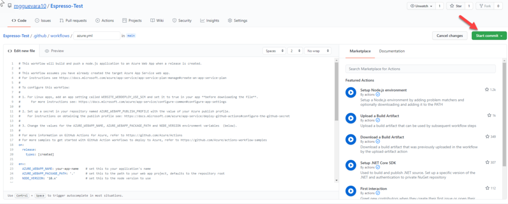After updating all these changes in `azure.yml,` click on `Start commit` on the upper right side, and commit the `azure.yml` file.